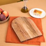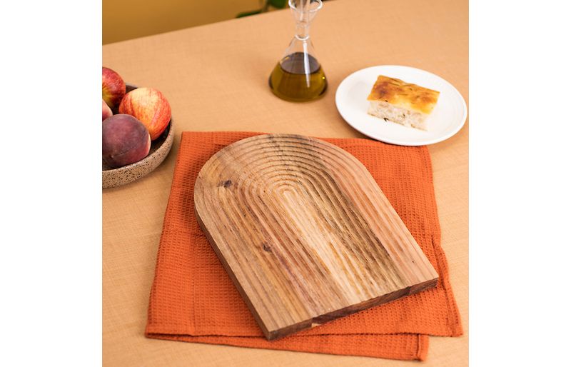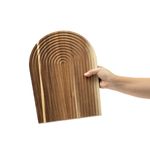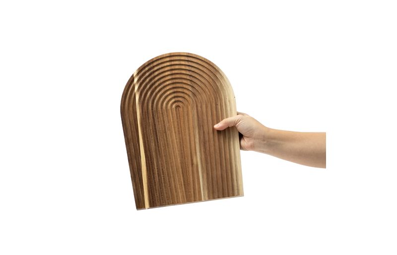 possui formato em arcos: muuuito moderna! é de madeira acácia: durável ¿e decorativa! para limpar, basta lavar em água corrente com esponja e detergente. seque em seguida. deixe em local seco e arejado.