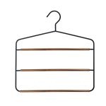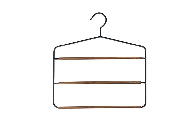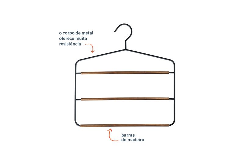 Esse é o cabide de metal triplo com barras de madeira na cor preto acácia da coleção ferreiro, da oikos.