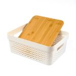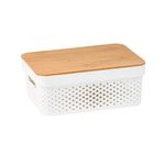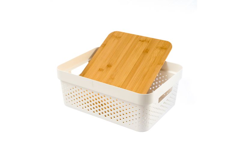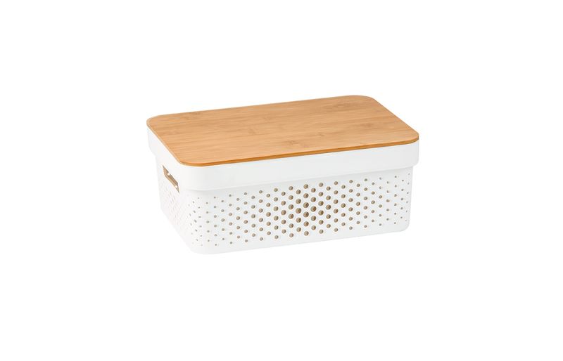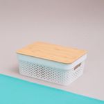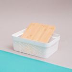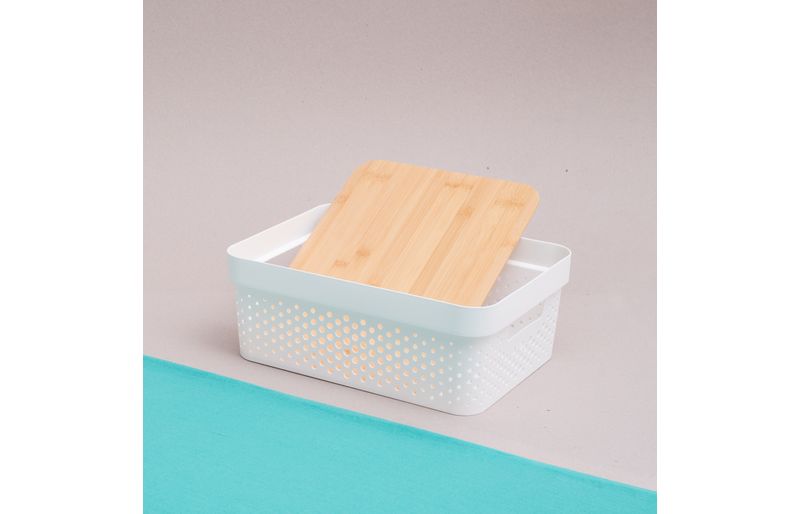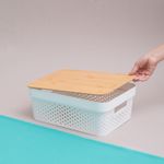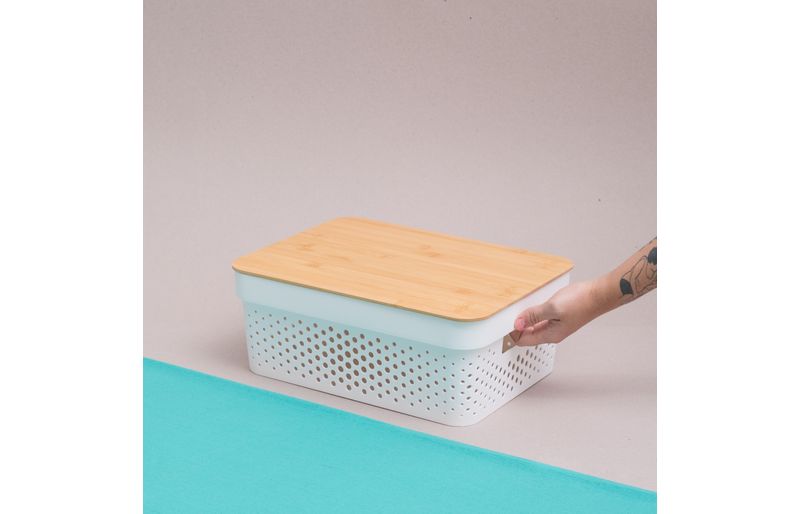 :: design moderno e natural: com corpo de plã¡stico vazado e tampa de bambu, alã©m de organizar, essa caixa tambã©m ajuda a decorar ambientes. fica uma graã§a ;)