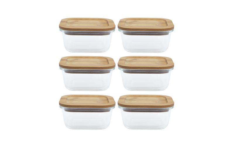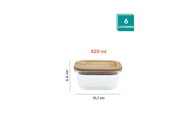 6 unidades - pote 520ml de vidro com tampa de bambu quadrado raso - oikos