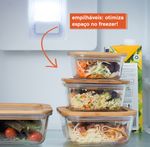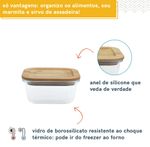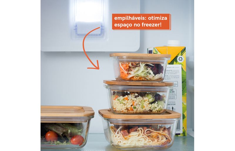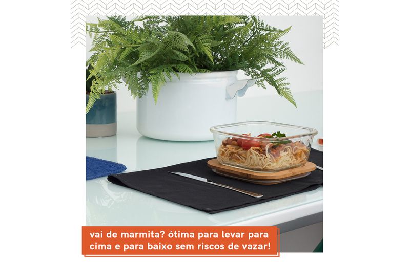 tampa de encaixe: sua tampa de bambu tem um rebaixo pensado para encaixar certinho na base do pote de vidro, sendo um apoio que protege mesas e bancadas do calor que esse pote aguenta - suporta até 400°c.