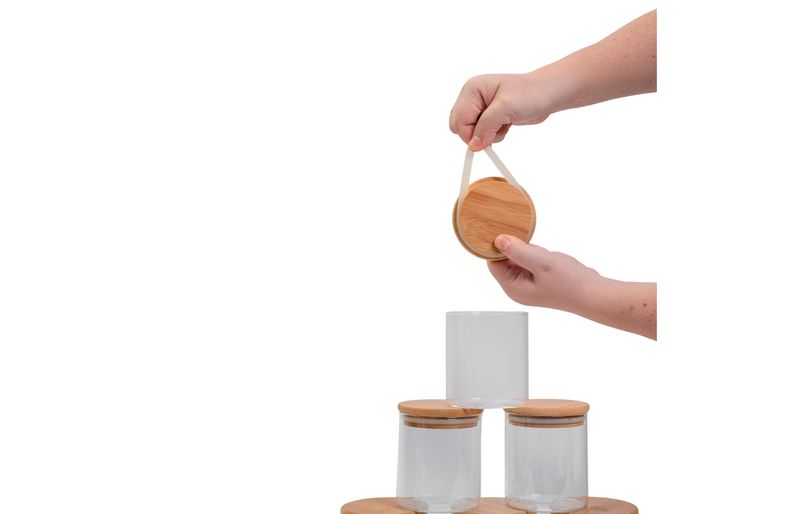 "esse é o conjunto do pote de vidro hermético redondo de 400ml para mantimentos com tampa de bambu da oikos.