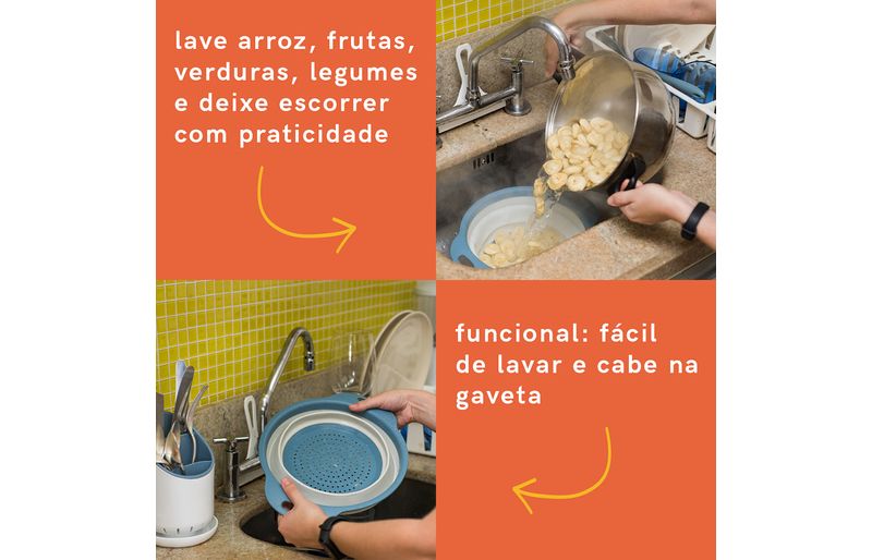 Esse é o escorredor médio para alimentos da oikos. isso é o que chamamos de praticidade que cabe na gaveta! ele é retrátil e ocupa somente 3cm quando fechado. com uma pequena elevação na base, que permite escorrer seus alimentos com o escorredor apoiado na pia. bacana para: massas, grãos, frutas e legumes.