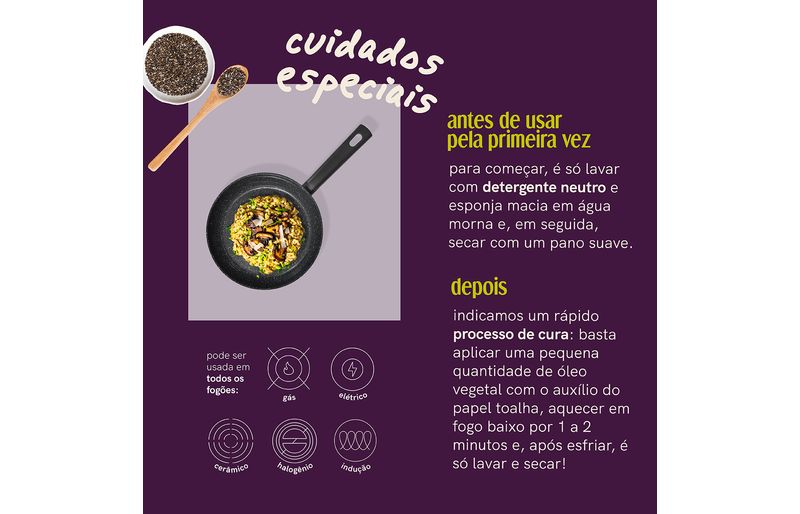 processo de cura indicado: basta aplicar uma pequena quantidade de óleo vegetal com o auxílio do papel toalha, aquecer em fogo baixo por 1 a 2 minutos e, após esfriar, é só lavar e secar!
