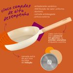 a frigideira tem 3,7mm de espessura na borda e 2,3mm no corpo: distribui melhor o calor e evita que os alimentos queimem. possui 5 camadas: antiaderente cerâmico, camada antidesgaste interna, alumínio, camada antidesgaste externa e pintura externa. também têm uma camada extra de aço inox na base de indução!