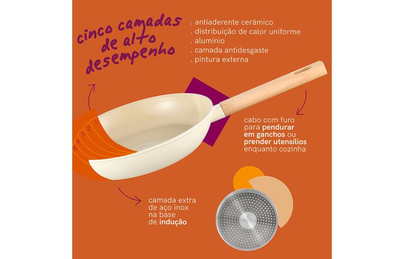 resistente e moderna, é perfeita para fazer suas receitas favoritas! ela tem antiaderente cerâmico de alto desempenho: evita que os alimentos grudem e é livre de toxinas! a frigideira é forjada: o processo confere maior durabilidade, distribuição de calor mais uniforme e melhora na retenção de calor, permitindo que a frigideira aqueça rapidamente e mantenha a temperatura.