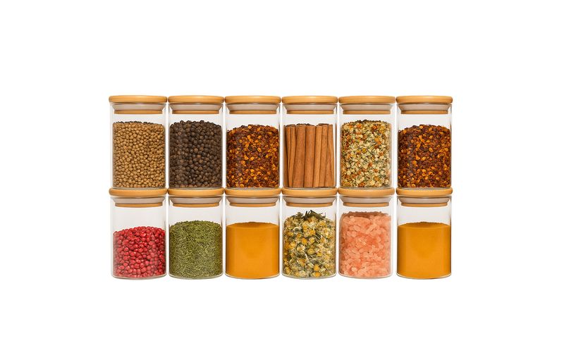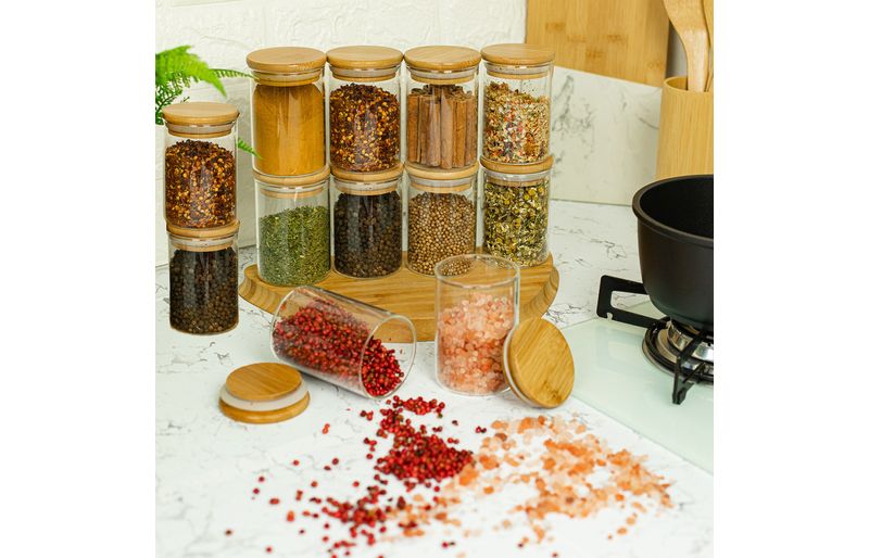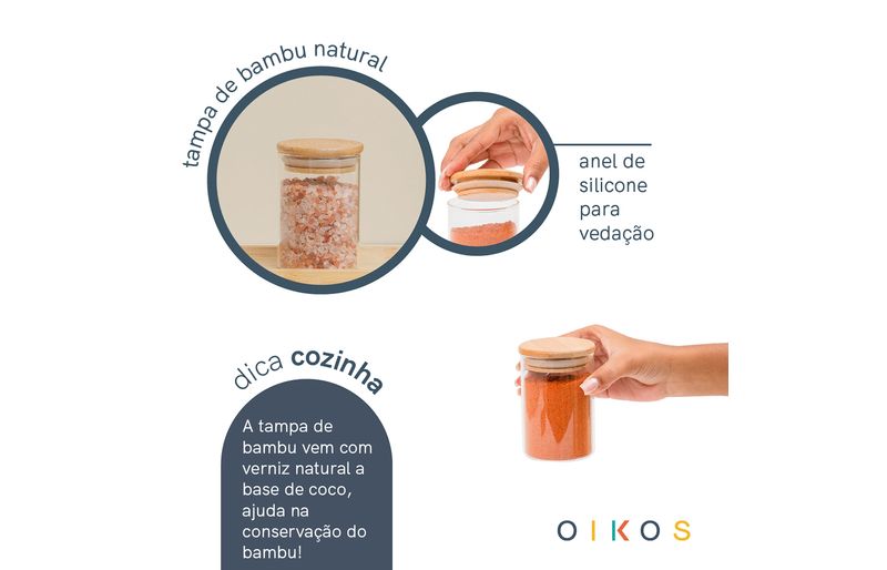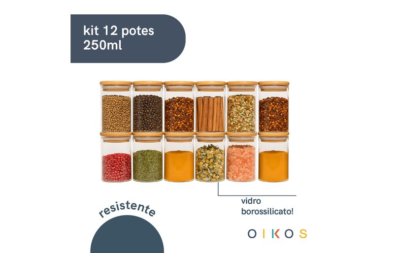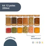 "conheça o kit de 12 potes de vidro com tampa de bambu herméticos para mantimentos de 250ml da oikos!