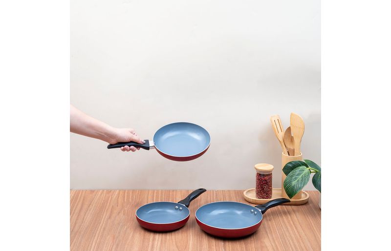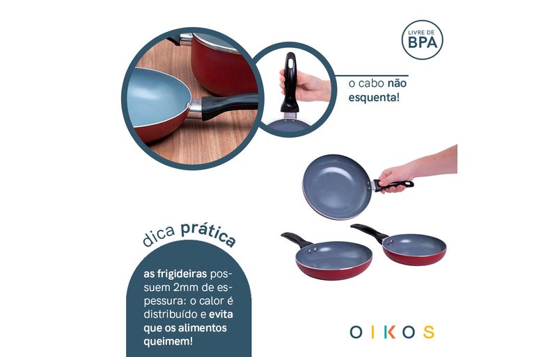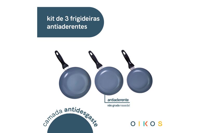 "conheça o kit de 3 frigideiras antiaderentes da coleção base da oikos!