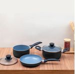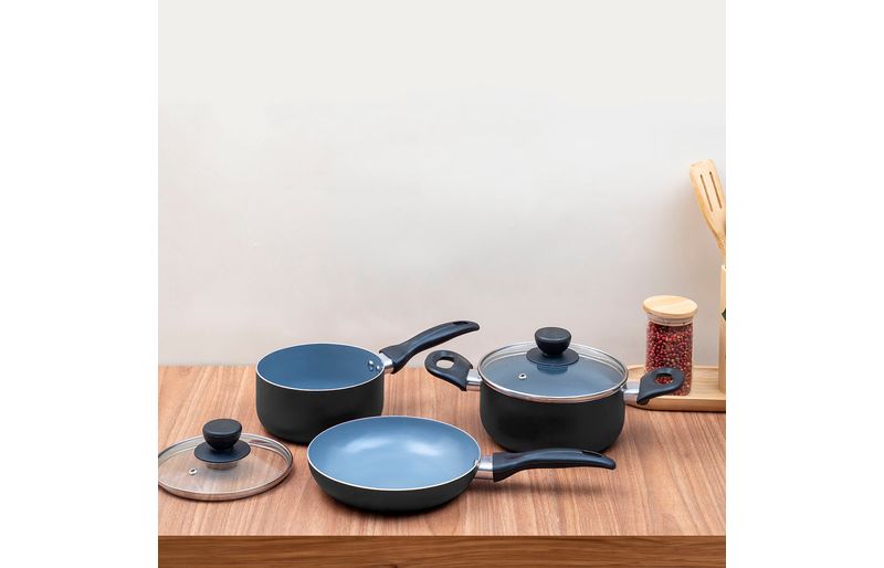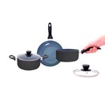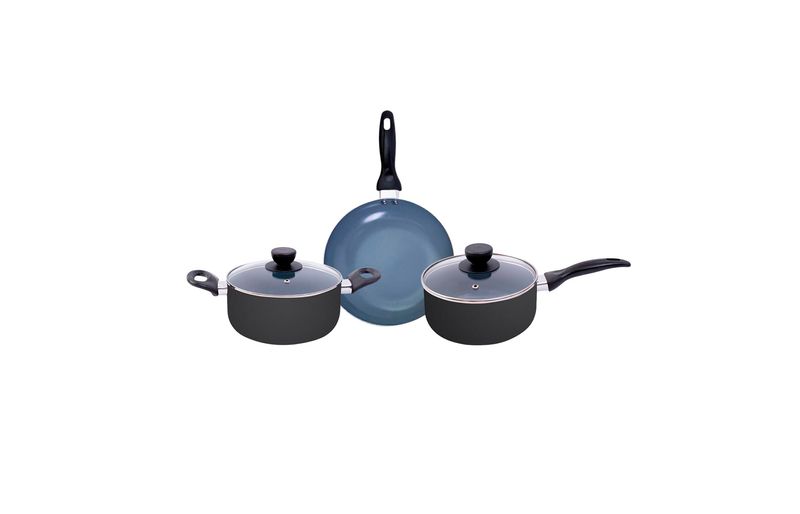 a panela e caçarola são de alumínio, cerâmica, aço inox, vidro temperado e baquelite. a frigideira é de alumínio, cerâmica e baquelite.
