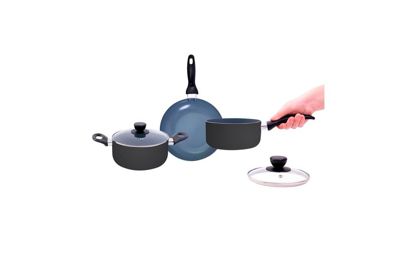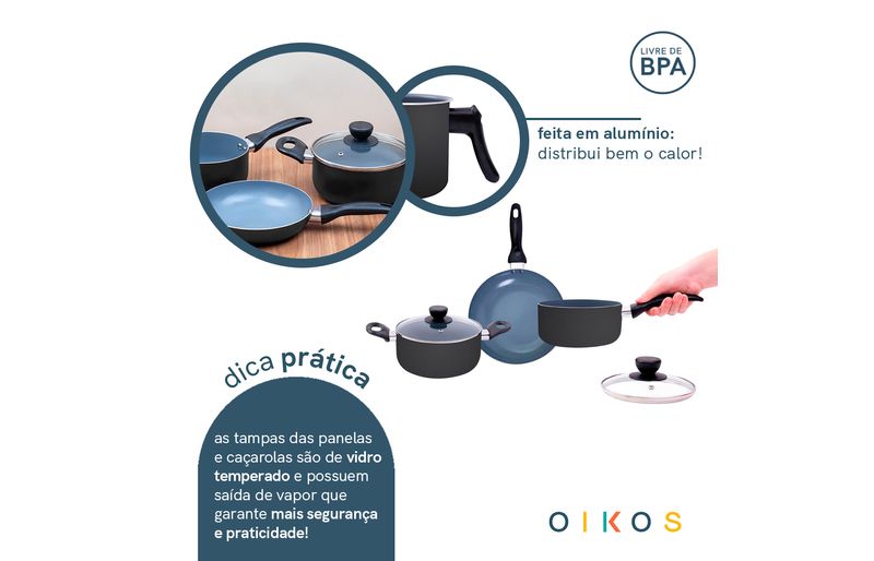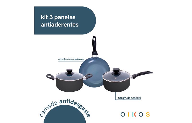 "conheça o jogo de panelas 3 pçs antiaderentes de cerâmica da coleção base da oikos!
