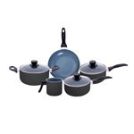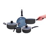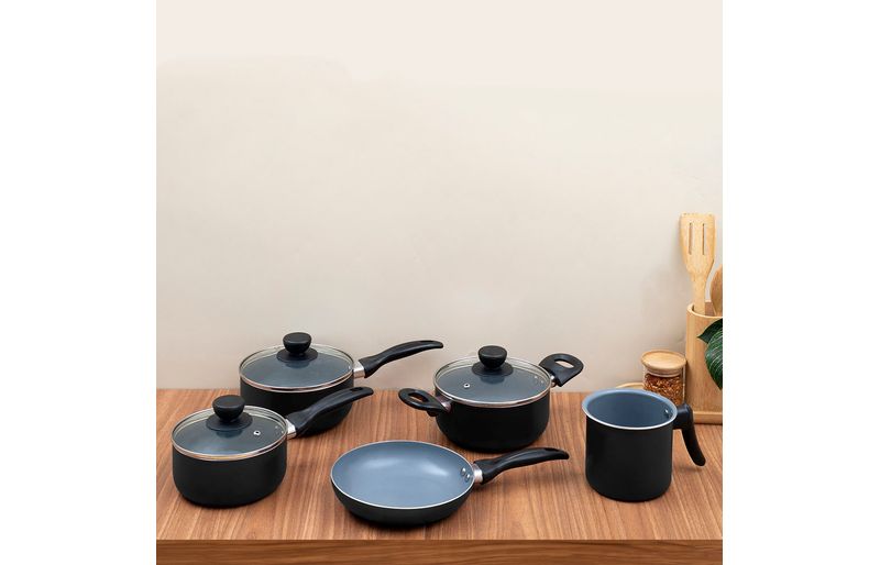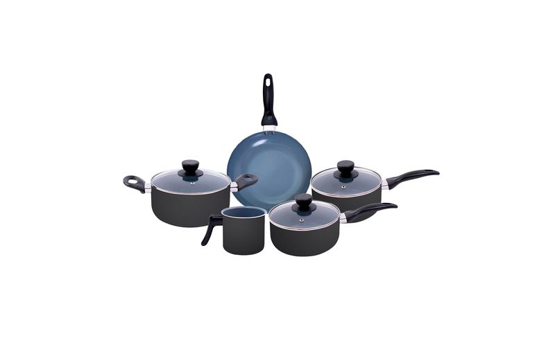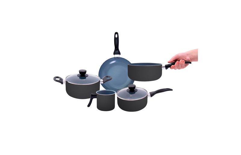 as panelas e a caçarolas são de alumínio, cerâmica, aço inox, vidro temperado e baquelite. a frigideira e a leiteira são de alumínio, cerâmica e baquelite.