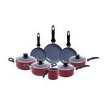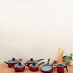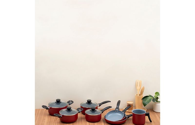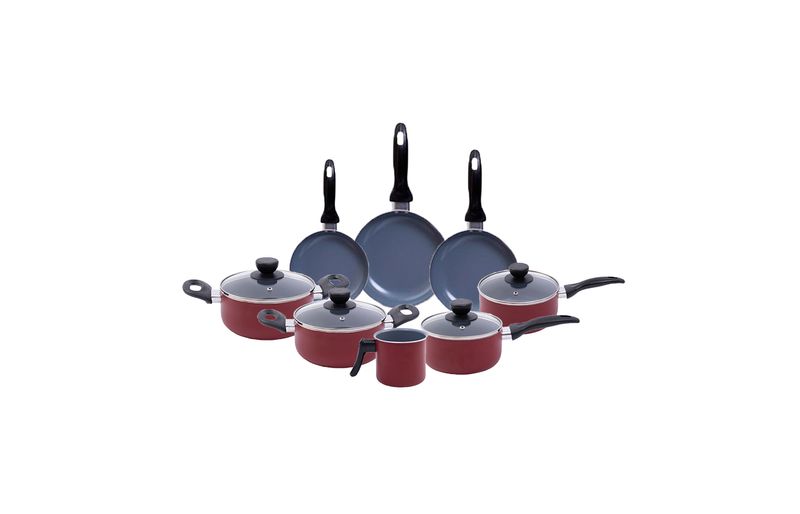 as panelas e caçarolas são de alumínio, cerâmica, aço inox, vidro temperado e baquelite. as frigideiras e a leiteira são de alumínio, cerâmica e baquelite.