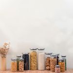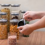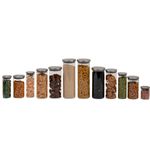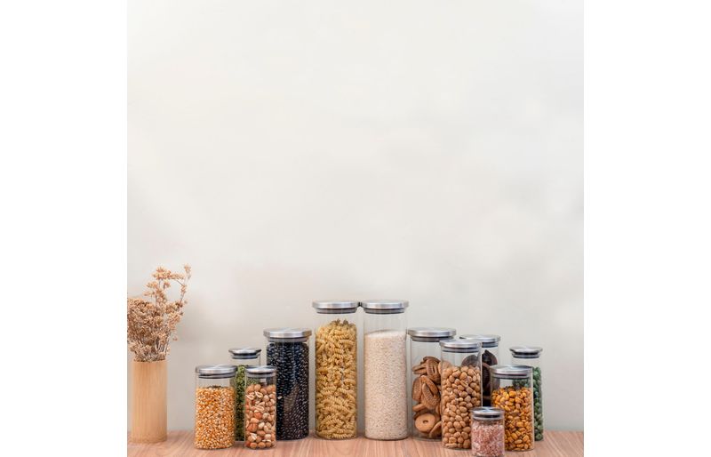 "conheça o kit de 12 potes de vidro com tampa de inox circular mantimento da oikos.
