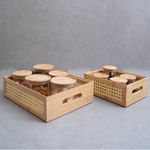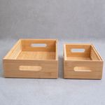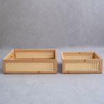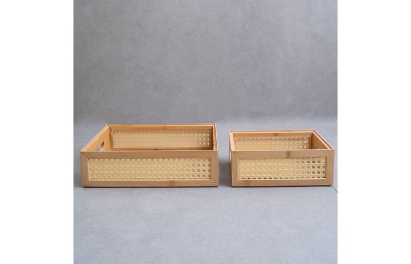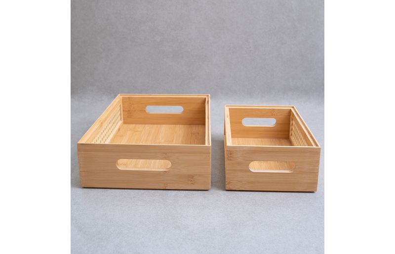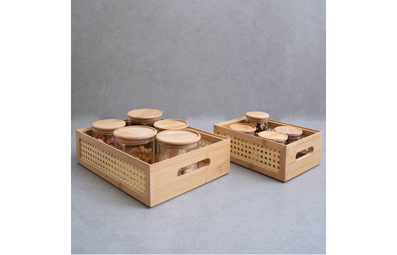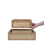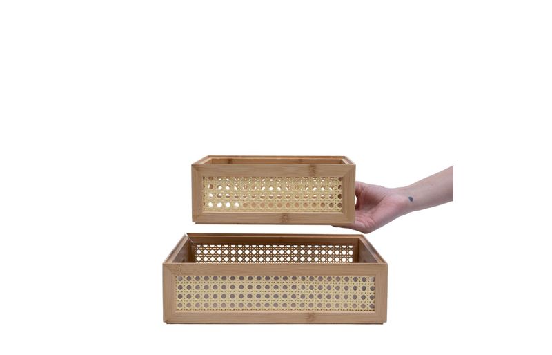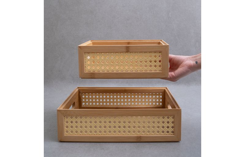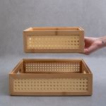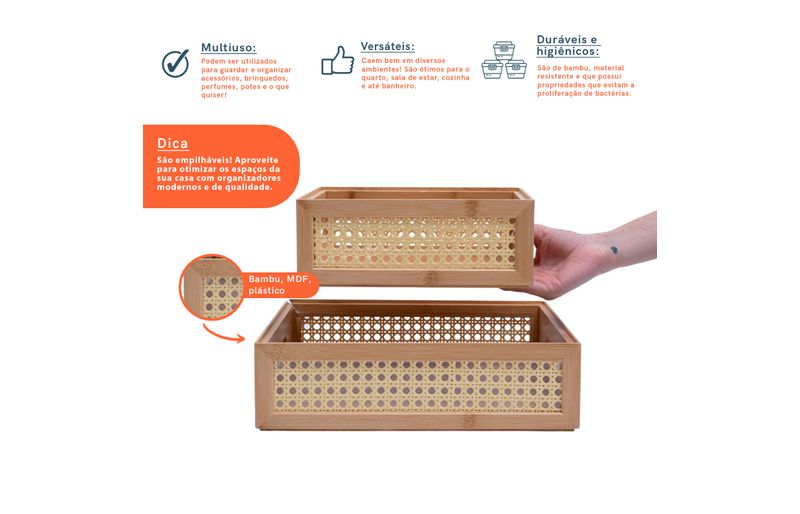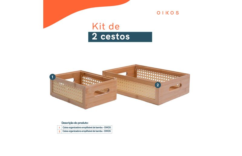 "conheça o kit de 2 caixas organizadoras empilháveis de bambu e palhinha 32cm e 24cm da oikos.