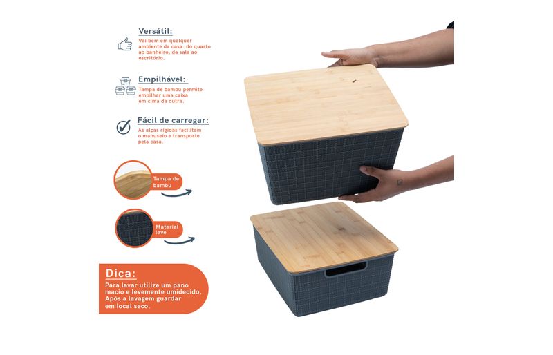 empilhável: além de ser charmosa, a tampa de bambu permite empilhar uma caixa em cima da outra, otimizando os espaços e deixando tudo bem organizado.