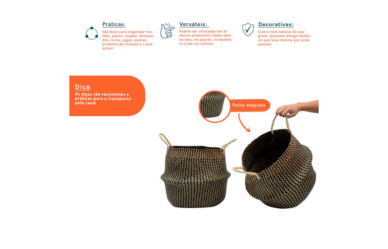 são de seagrass. para limpar, basta utilizar um pano limpo e seco. para uma limpeza mais pesada, pode ser lavada manualmente em água corrente e detergente neutro. deixe secar completamente em local arejado.