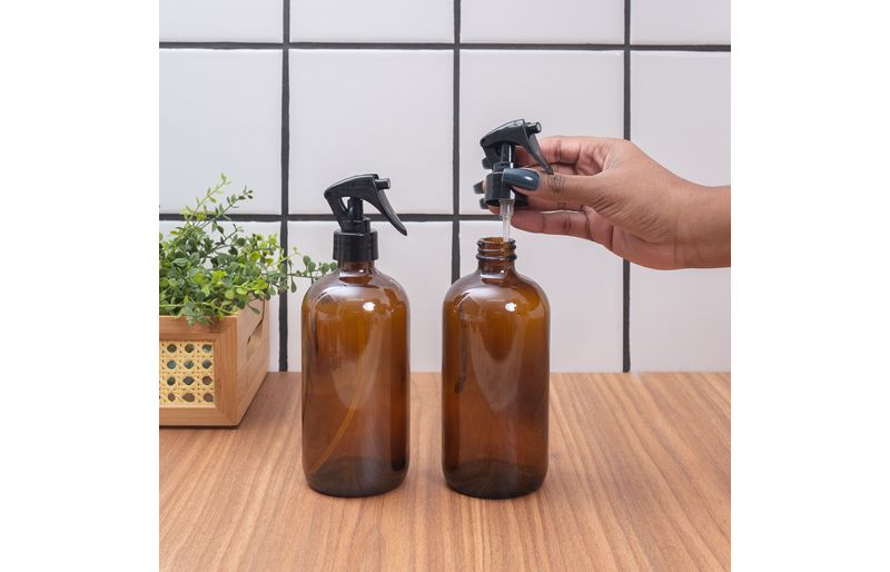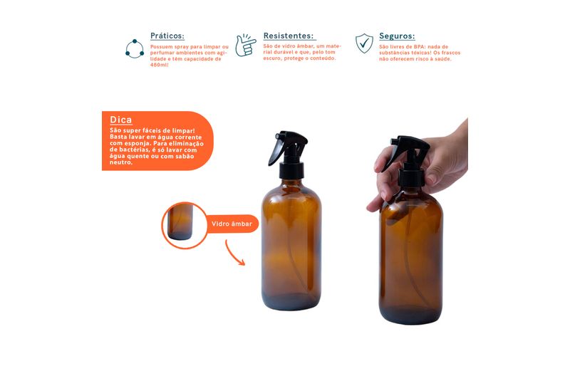 práticos e resistentes, são ótimos para limpar ou perfumar ambientes. possuem spray para borrifar e são de vidro âmbar, um material que é tendência atual, super resistente e fácil de limpar!
