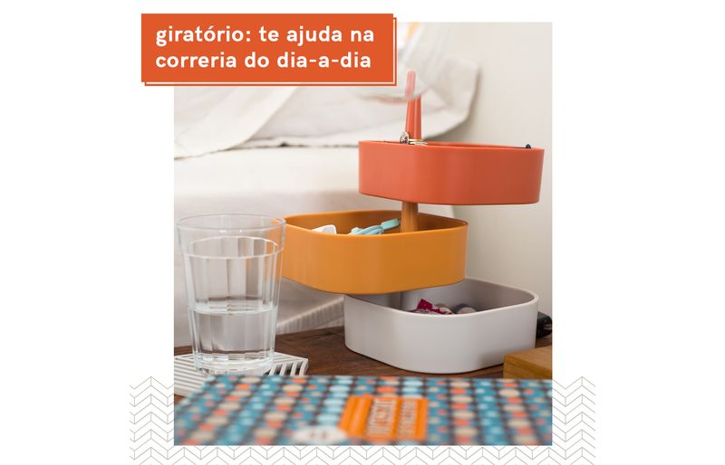 :: giratório: ao empilhar através do suporte, ele consegue girar para ser mais fácil a enxergar o que tem ali dentro.