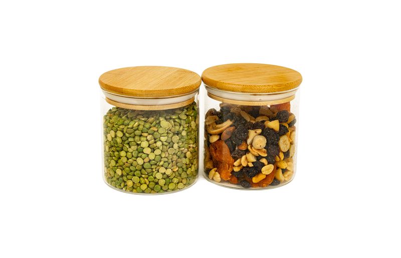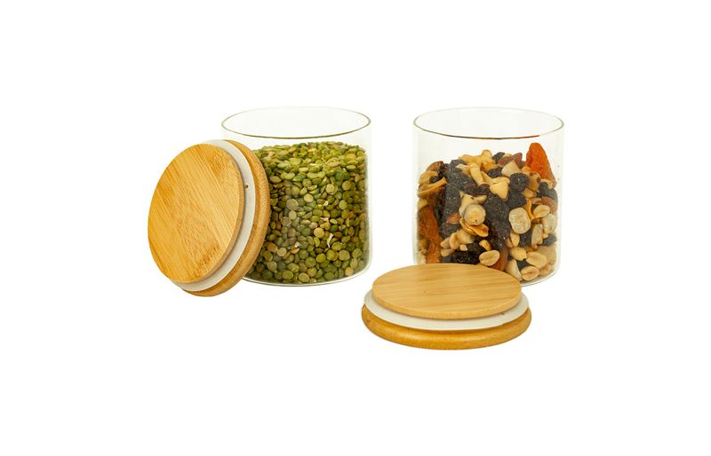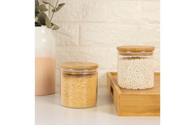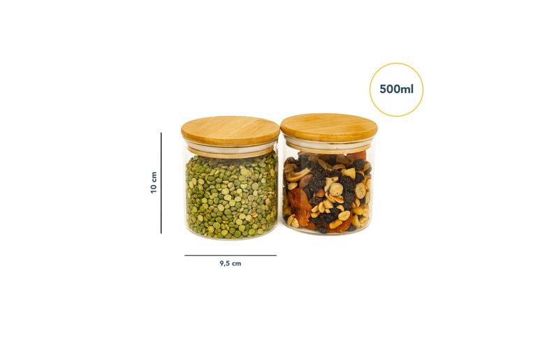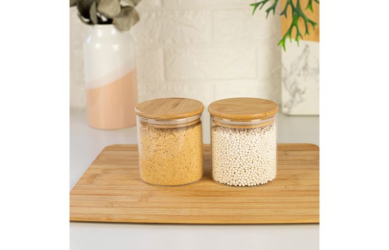 2 unidades pote 500ml de vidro com tampa de bambu circular mantimento – oikos