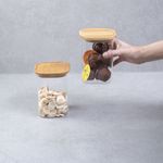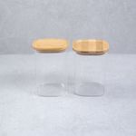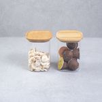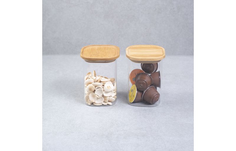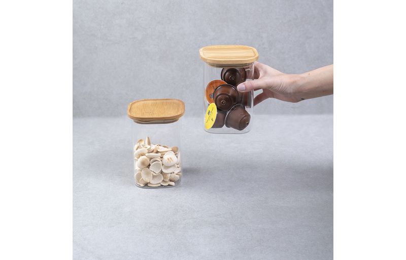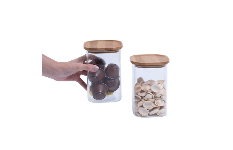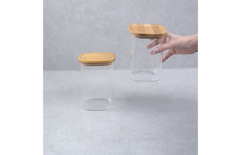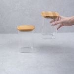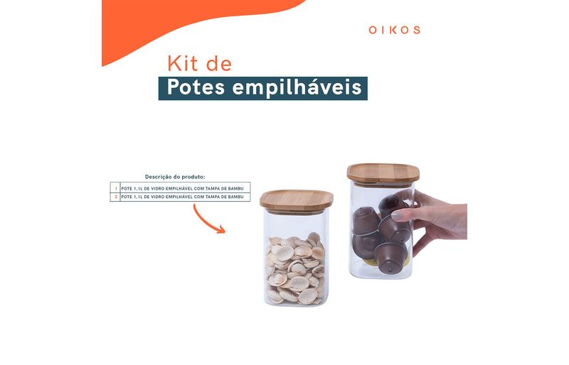 """conheça o kit de 2 potes herméticos de vidro com tampa de bambu empilháveis quadrados 1,1l da oikos.
