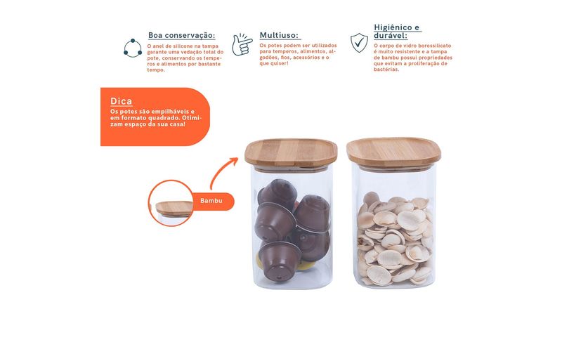 garantem boa conservação, são higiênicos, duráveis e, além disso, a tampa de bambu pode ser um descanso para que, caso o pote esteja em alta temperatura, não danifique mesas e bancadas.