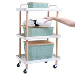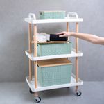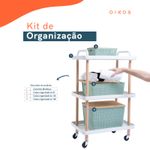 "conheça o kit com 3 caixas organizadoras verde de 4l, 12l e 18l e carrinho multiuso branco 3 andares da oikos.