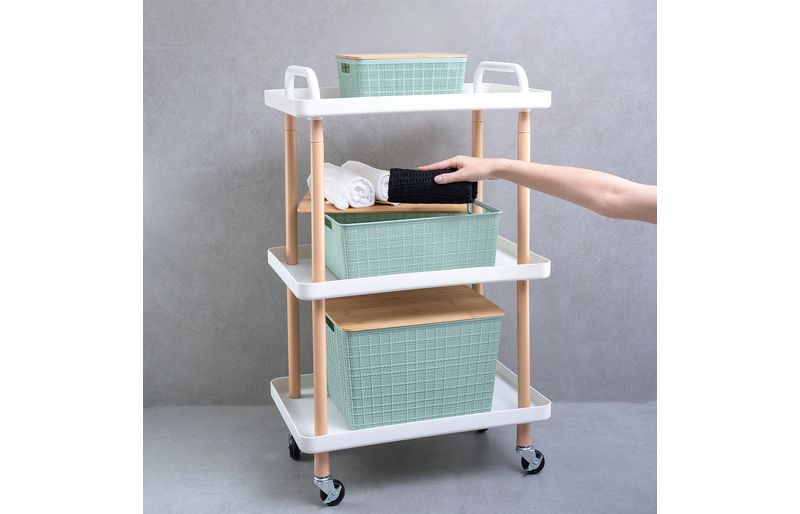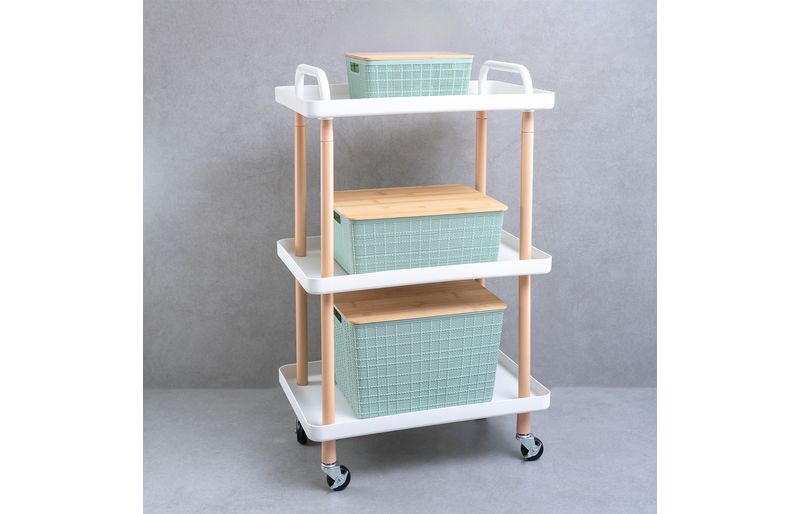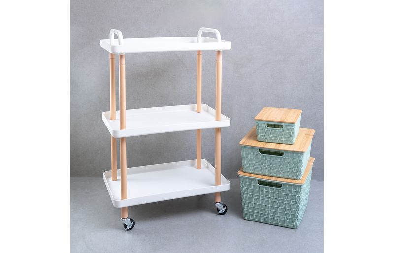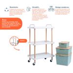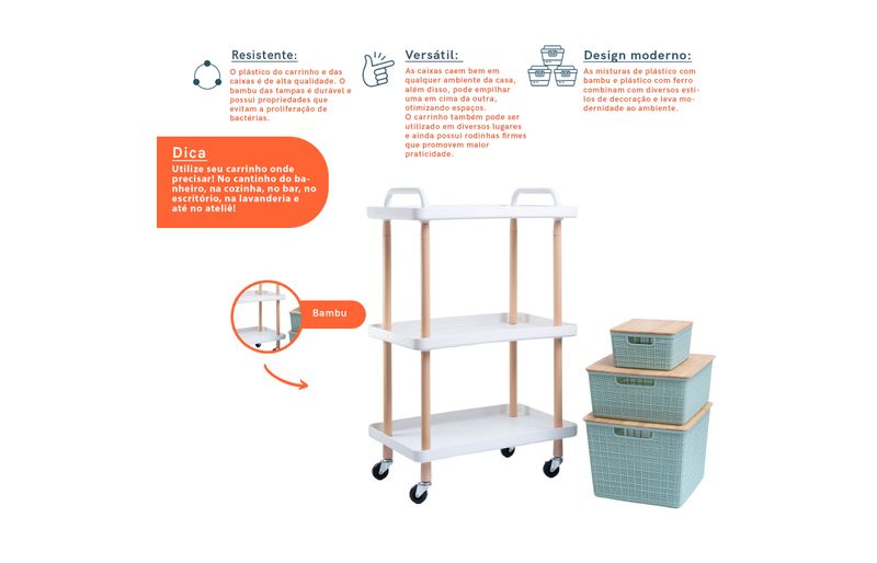 resistente, versátil e decorativo, é o kit ideal para organizar seus itens e levar charme ao ambiente. as caixas caem bem em qualquer ambiente da casa e são empilháveis, otimizando espaços. o carrinho também pode ser utilizado em diversos lugares e ainda possui rodinhas firmes que promovem praticidade.