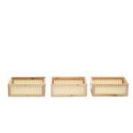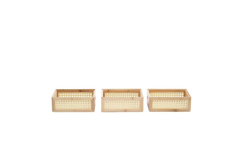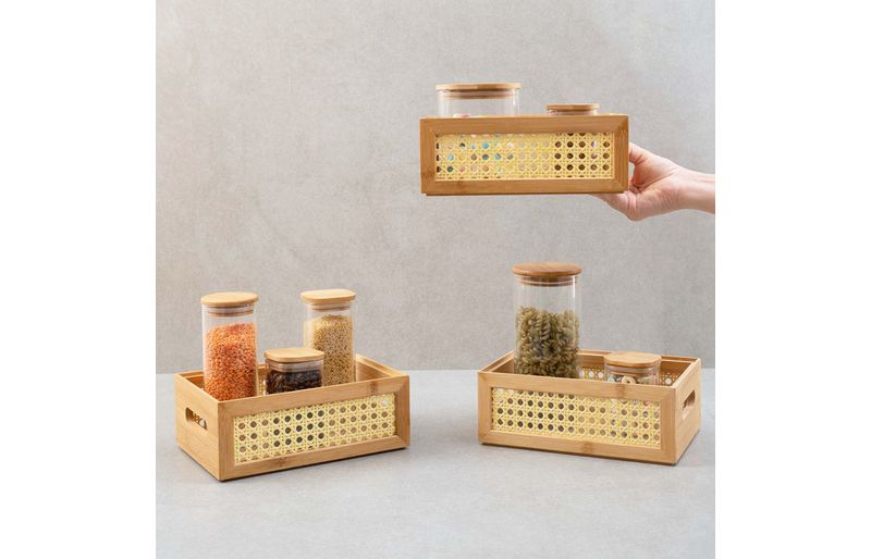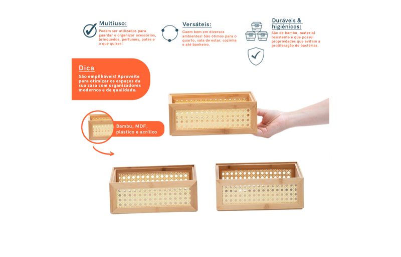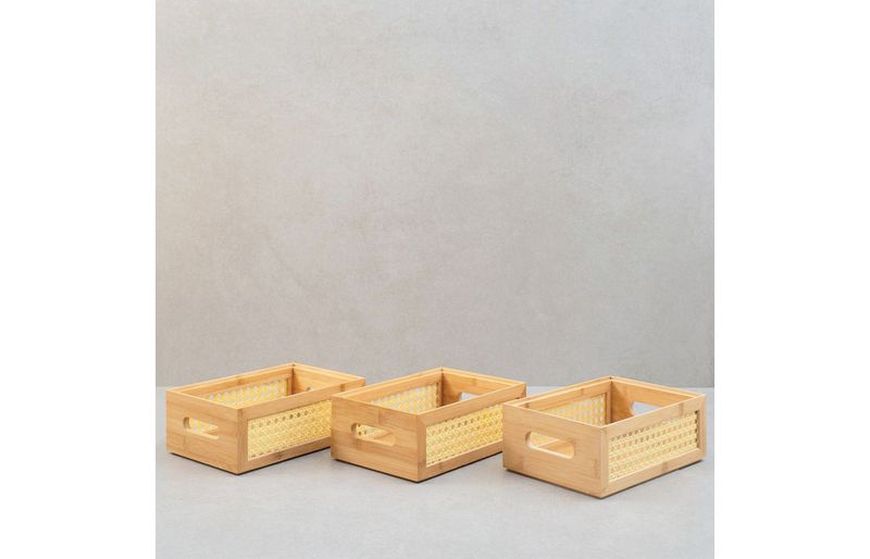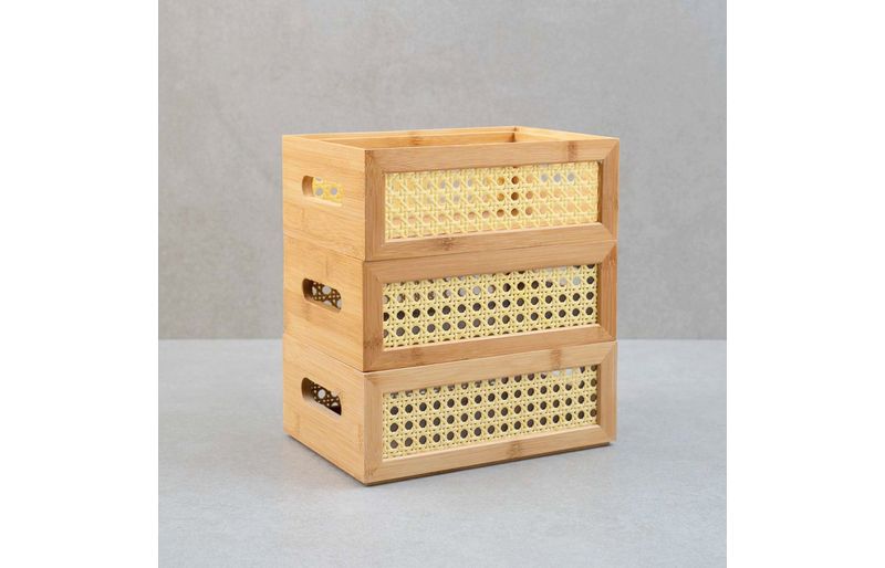3 caixas organizadoras empilháveis de bambu e palhinha 24cm"