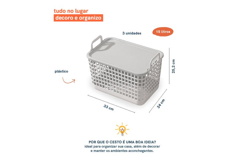 03 cestos de plástico com tampa médio (15l) cinza - oikos