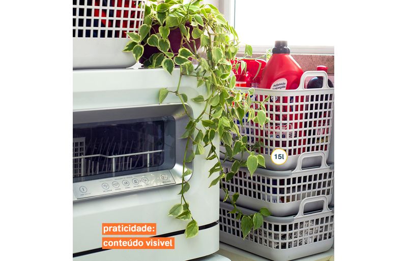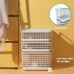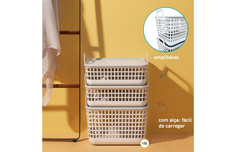 versátil que só ele, vai no quarto, no banheiro, na sala, na lavanderia e no escritório. bacana para guardar sapatos, brinquedos, toalhas, documentos, roupas e mais! sua tampa serve de apoio para outro cesto, ajudando a ocupar menos espaço, além de deixar tudo bem organizado. e além de versátil ele também é bem prático, já que suas alças ajudam a puxar de dentro do armário e carregar pela casa. o corpo telado permite visualizar direitinho o que tem ali dentro, sendo mais fácil lembrar o que foi guardado.