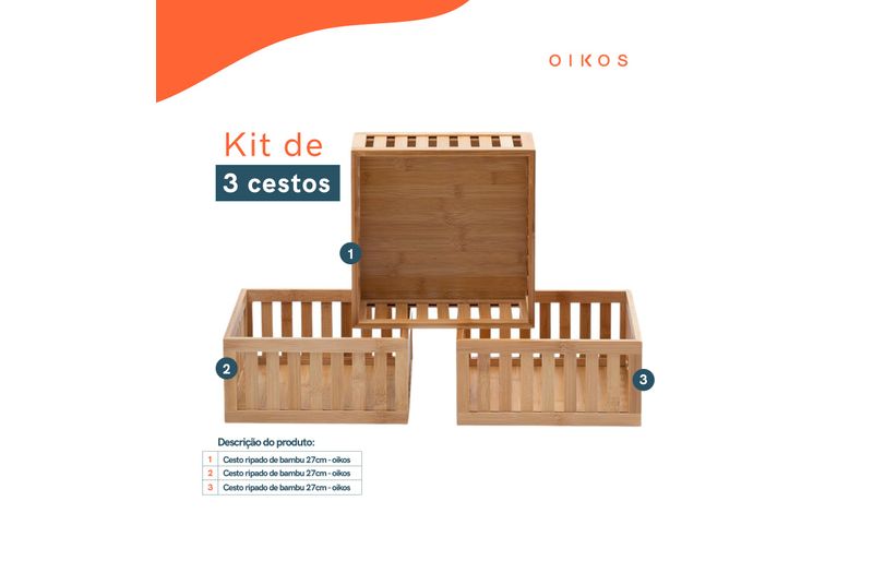"""conheça o kit de 3 cestos ripados de bambu 27cm da oikos.