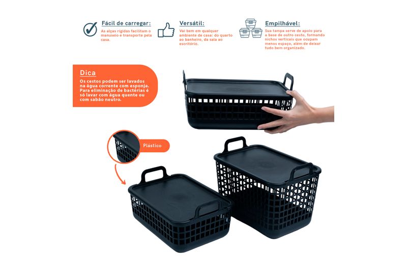 empilhável: sua tampa serve de apoio para a base de outro cesto, formando nichos verticais que ocupam menos espaço, além de deixar tudo bem organizado.