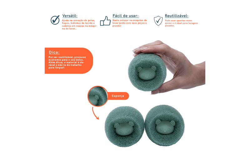 durável e reutilizável: você pode usar as esponjas por várias lavagens. pra não danificar o produto, evite usar em máquinas secadoras. ah, e pode ficar tranquilo: ele não danifica tecidos, tá bem?""