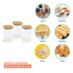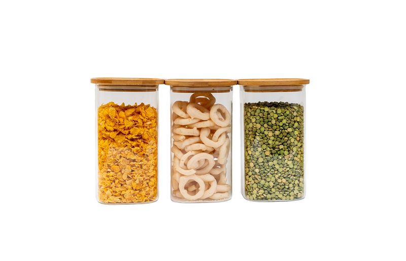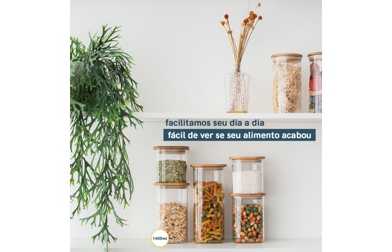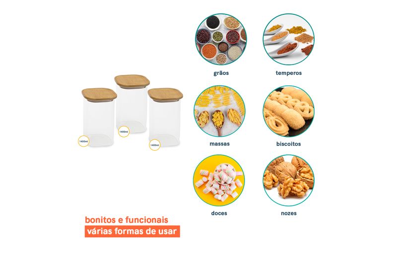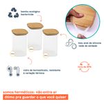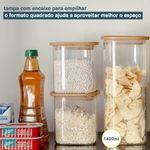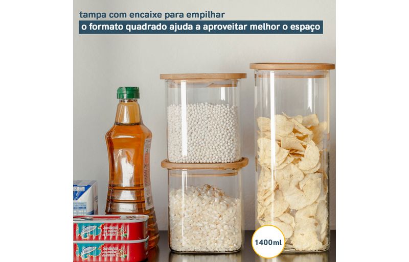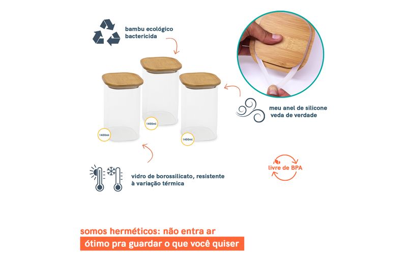 03 potes de vidro hermético para mantimentos quadrado de 1400ml com tampa de bambu – oikos