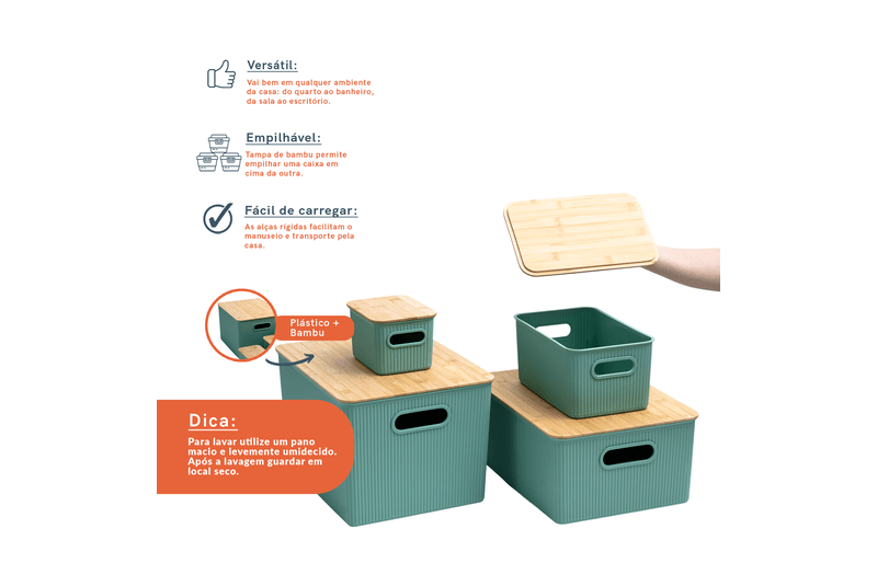 prático: bom para organizar roupas, toalhas, lençóis, itens do banheiro, brinquedos, sapatos, materiais de escritório, produtos de limpeza e muito mais. versátil: vai bem em qualquer ambiente da casa: do quarto ao banheiro, da sala ao escritório. você que manda! empilhável: além de ser charmosa, a tampa de bambu permite empilhar uma caixa em cima da outra, otimizando os espaços e deixando tudo bem organizado. fácil de carregar: as alças rígidas facilitam o manuseio e transporte pela casa."