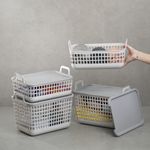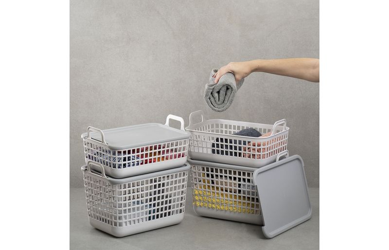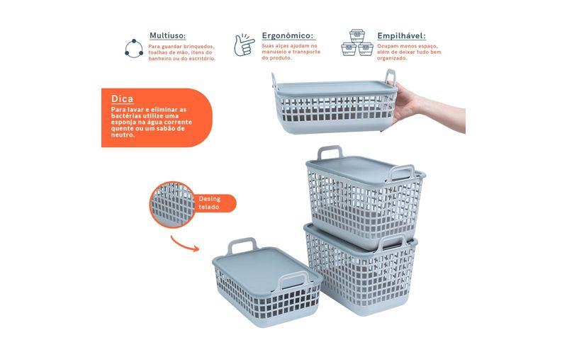empilhável: sua tampa serve de apoio para a base de outro cesto, formando nichos verticais que ocupam menos espaço, além de deixar tudo bem organizado.