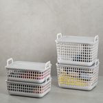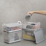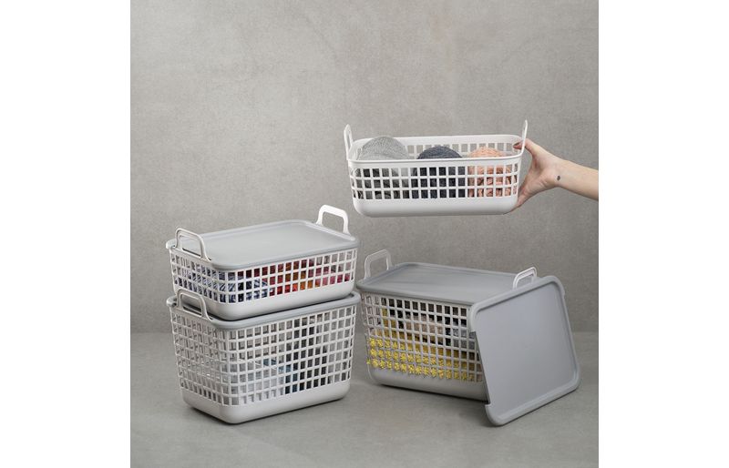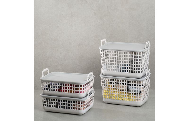 esses são os cestos 9l de plástico pequeno cinza telado com tampa e alças da oikos.