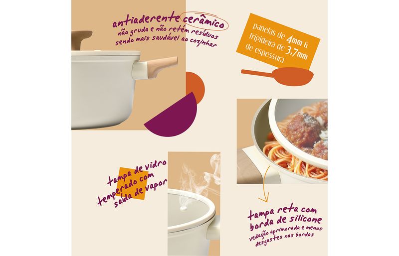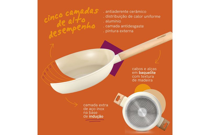 resistentes e modernas, são perfeitas para fazer suas receitas favoritas! elas têm antiaderente cerâmico de alto desempenho: evitam que os alimentos grudem e são livre de toxinas! as panelas são forjadas: o processo confere maior durabilidade, distribuição de calor mais uniforme e melhora na retenção de calor, permitindo que a panela aqueça rapidamente e mantenha a temperatura.