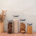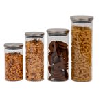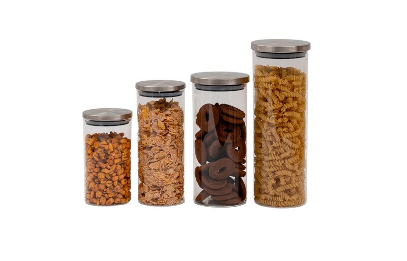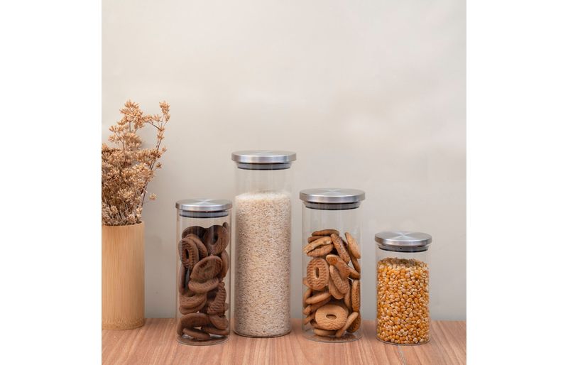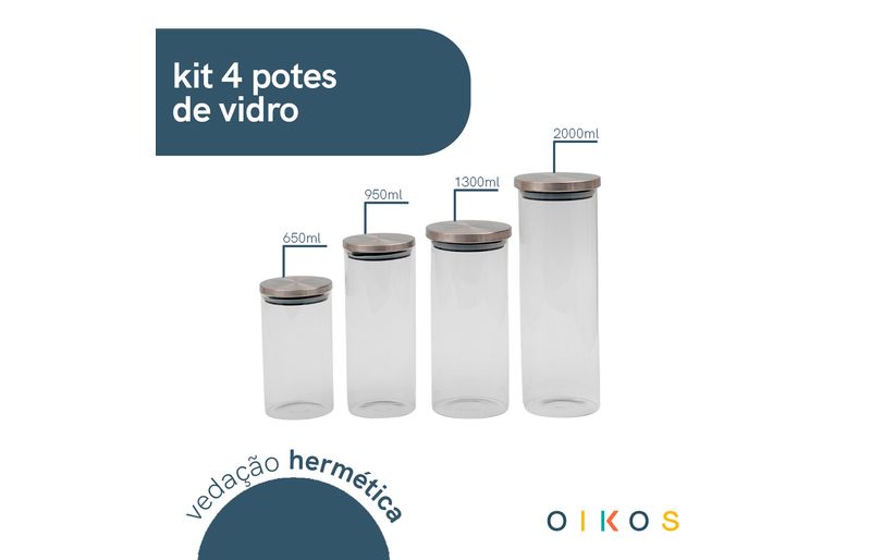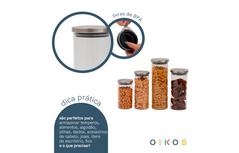 "conheça o kit de 4 potes de vidro com tampa de inox circular mantimento da oikos.