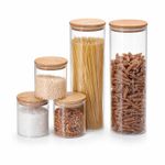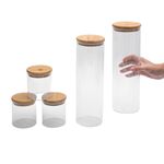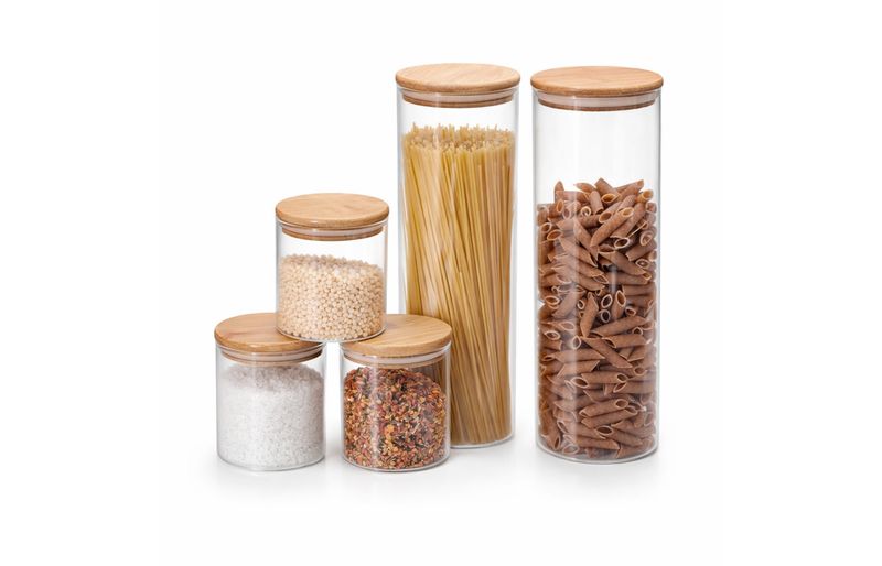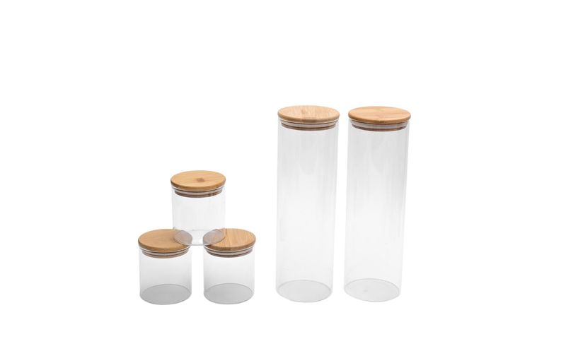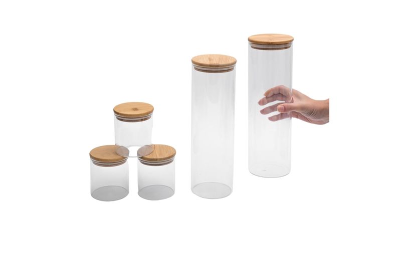 "conheça o kit de 5 potes de vidro herméticos com tampa de bambu de 500ml e 2l da oikos.