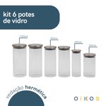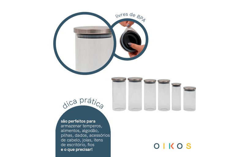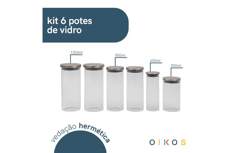 "conheça o kit de 6 potes de vidro com tampa de inox circular mantimento da oikos.