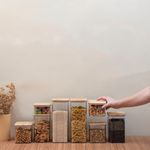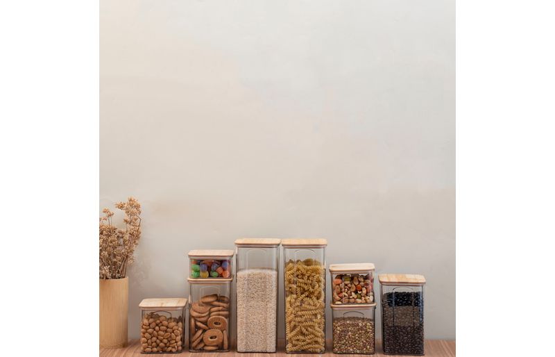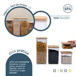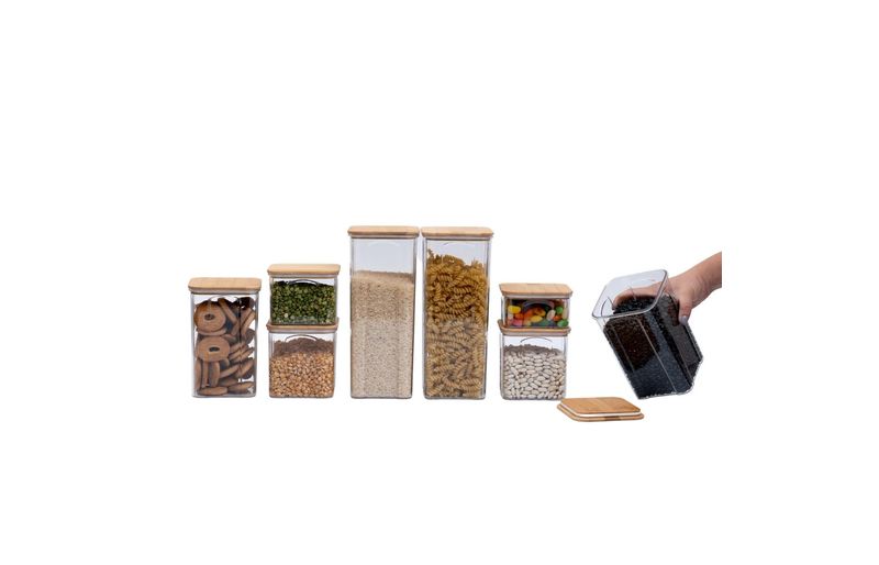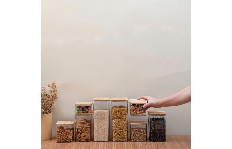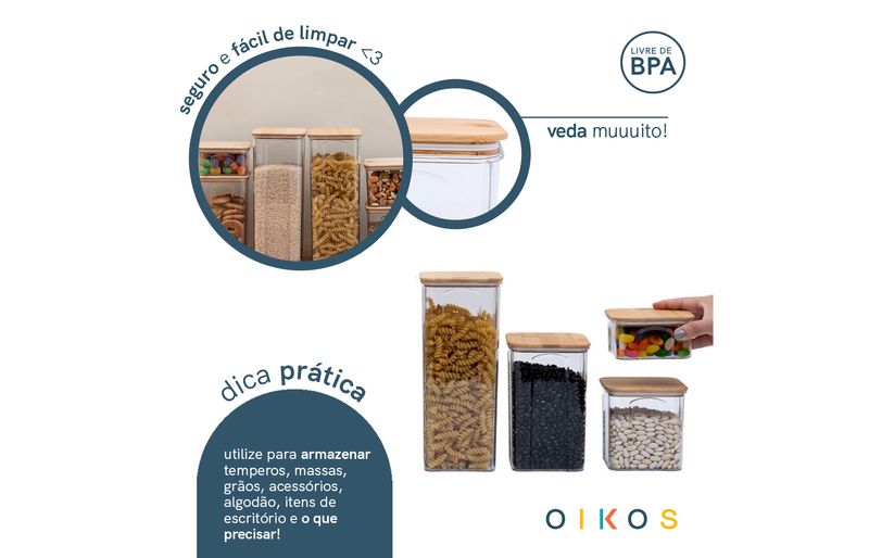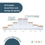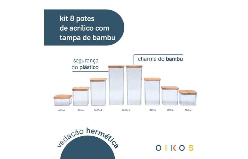 "conheça o kit de 8 potes de acrílico com tampa de bambu quadrado transparentes de 415ml, 650ml, 900ml, 1,4l e 2l da oikos.