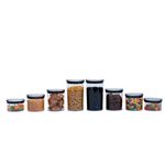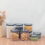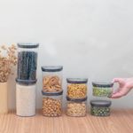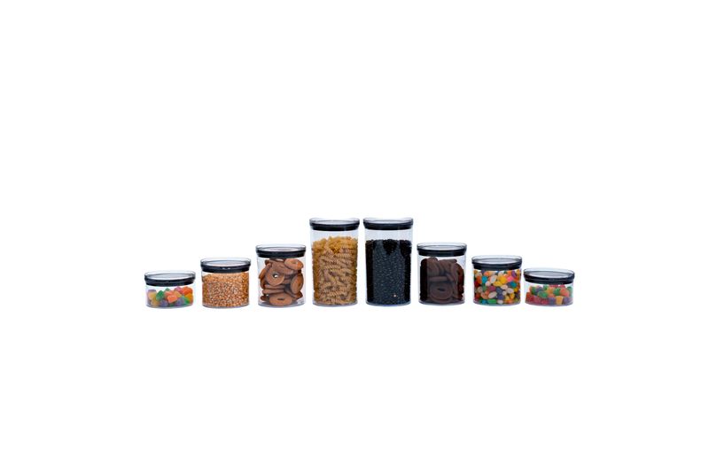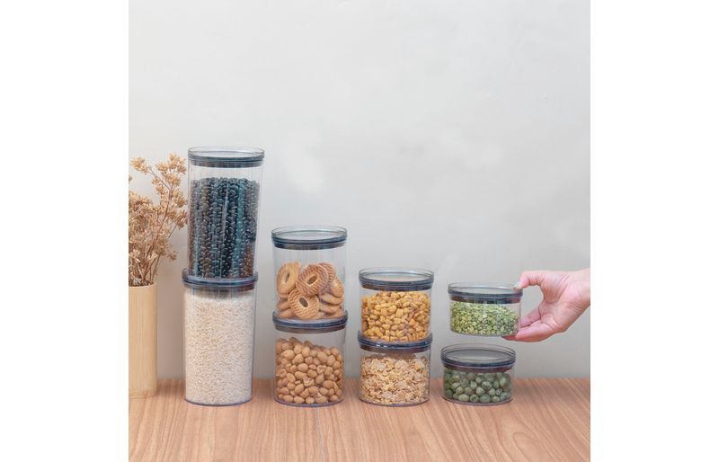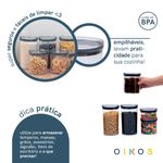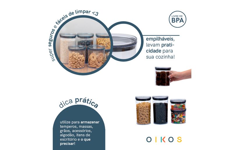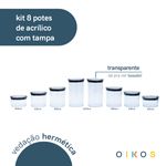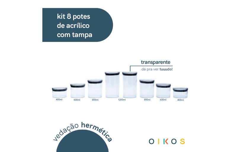 "conheça o kit de 8 potes de acrílico com tampa circular empilháveis transparentes de 400ml, 630ml, 850ml e 1,2l da oikos.
