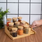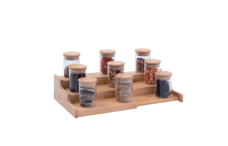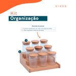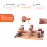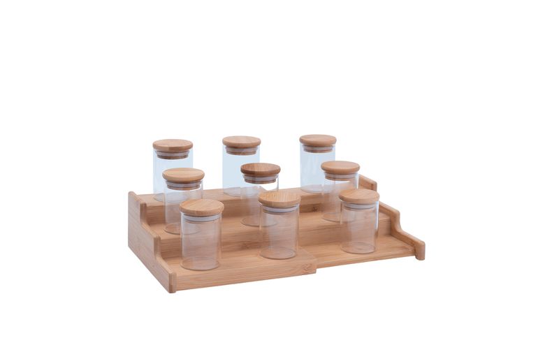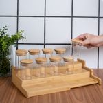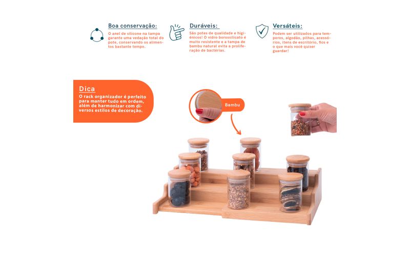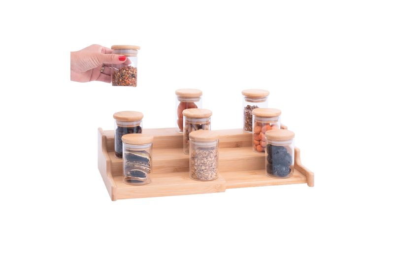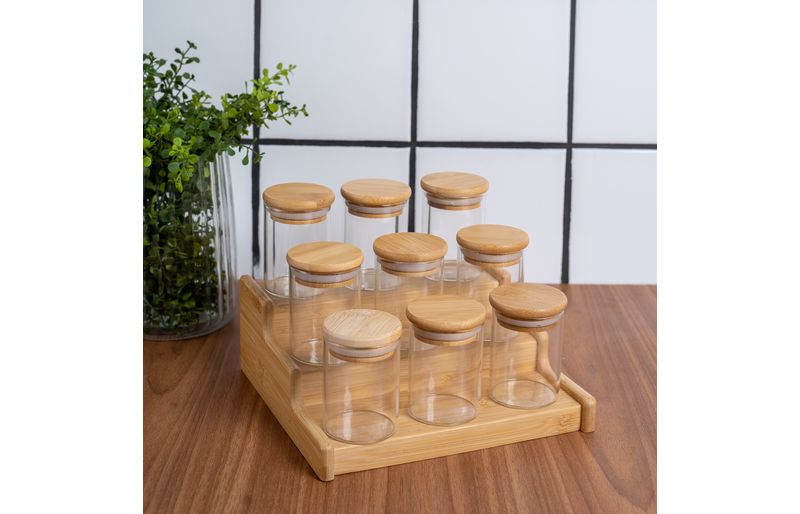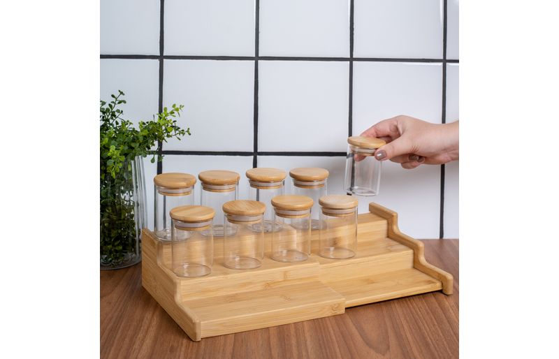 "conheça o kit casa com 9 potes de vidro herméticos com tampa de bambu 110ml e rack organizador de bambu da oikos.