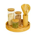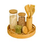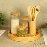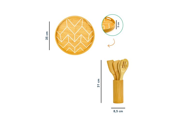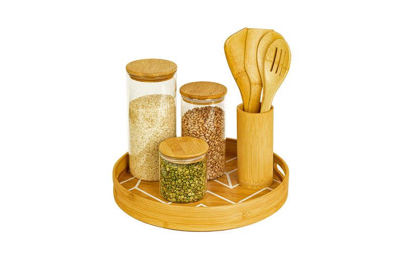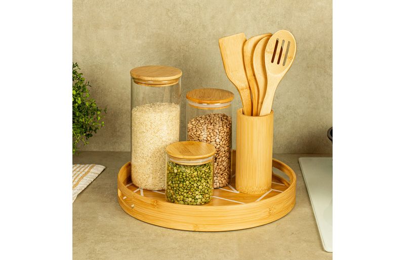 Este é o kit bandeja redonda em bambu com 35cm, com utensílios e potes de vidro de mantimentos com tampa de bambu de 1650,1100 e 500ml.