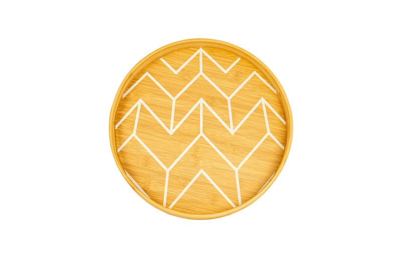 decorativa: ela combina com qualquer lugar da casa. até pendurada na parede, essa bandeja se dá bem - a mistura do tom natural do bambu com a estampa geométrica dá um toque rústico e, ao mesmo tempo, moderno na decoração.