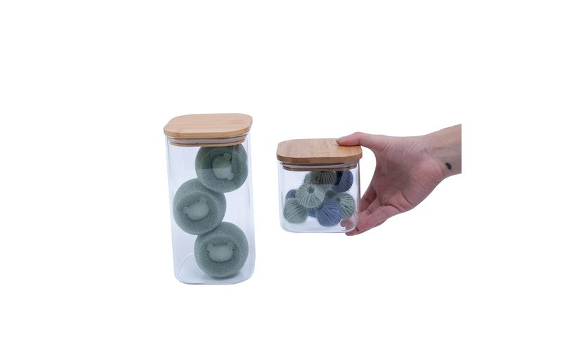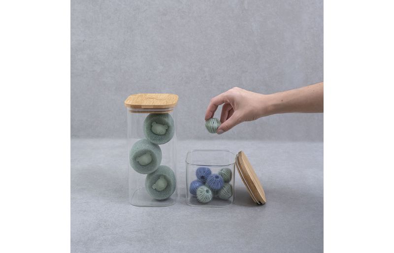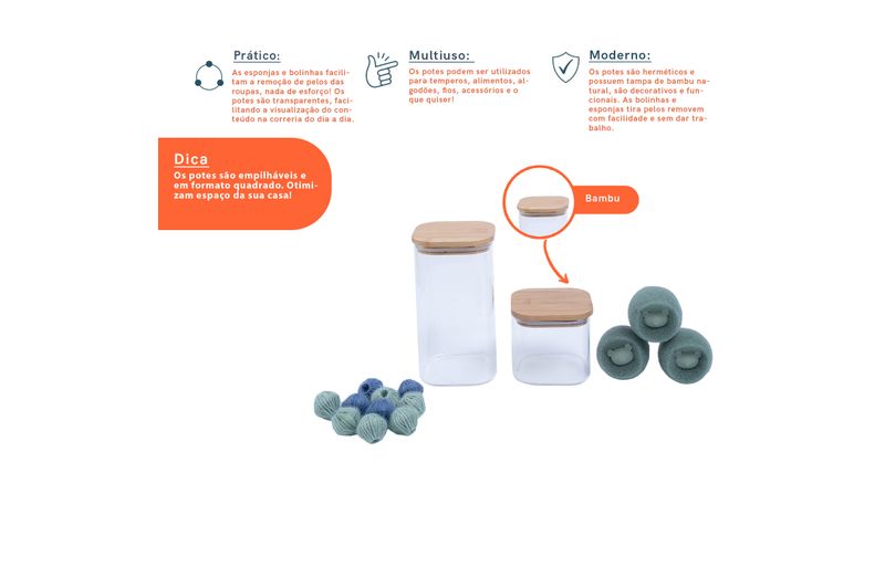 versáteis, fáceis de usar e reutilizáveis, as bolinhas e esponjas ajudam a soltar os pelos, fiapos, cabelos e bolinhas que ficam presos nas roupas. promovendo armazenamento facilitado, prático e decorativo, é os potes são ótimos para organização.