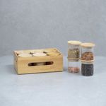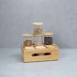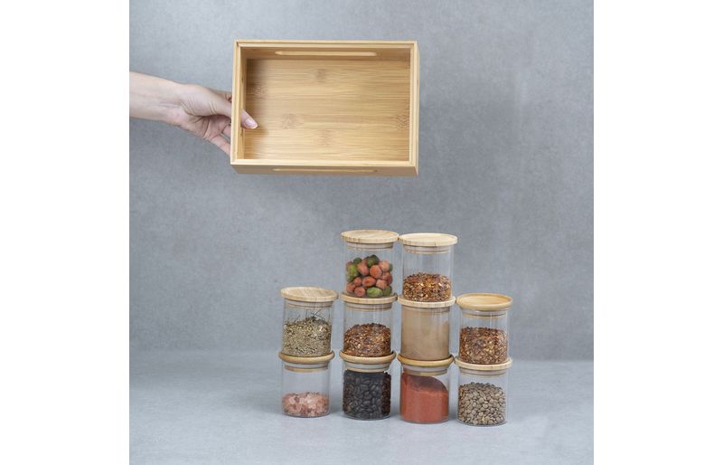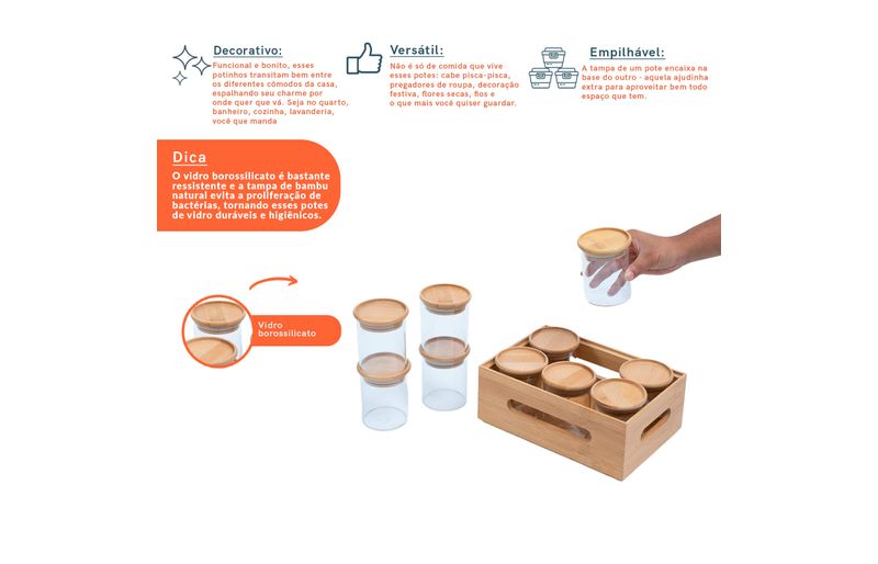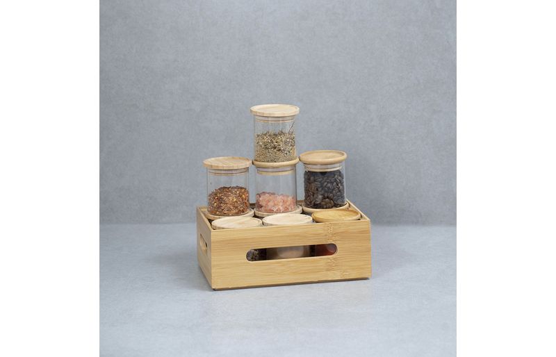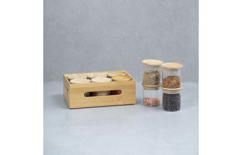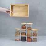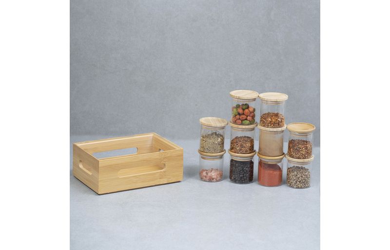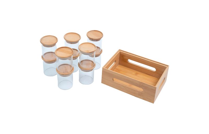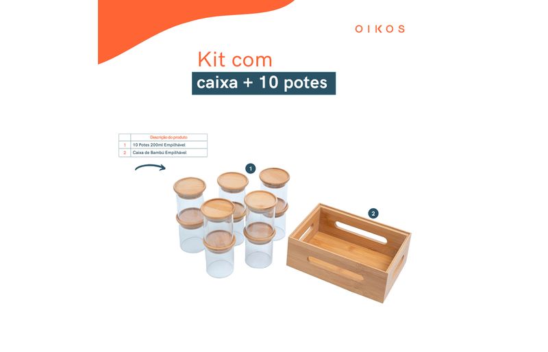"esse é o kit caixa de bambu vazada e 10 potes de vidro 200ml – oikos