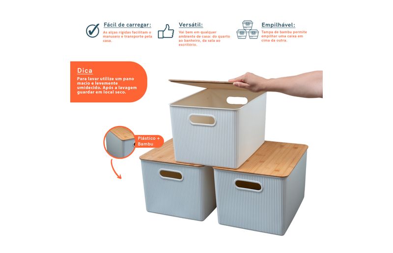 empilhável: além de ser charmosa, a tampa de bambu permite empilhar uma caixa em cima da outra, otimizando os espaços e deixando tudo bem organizado.