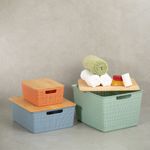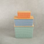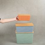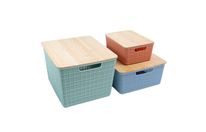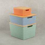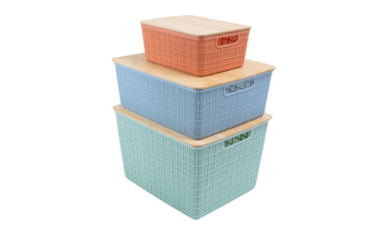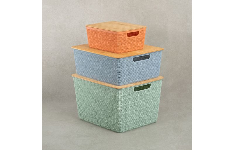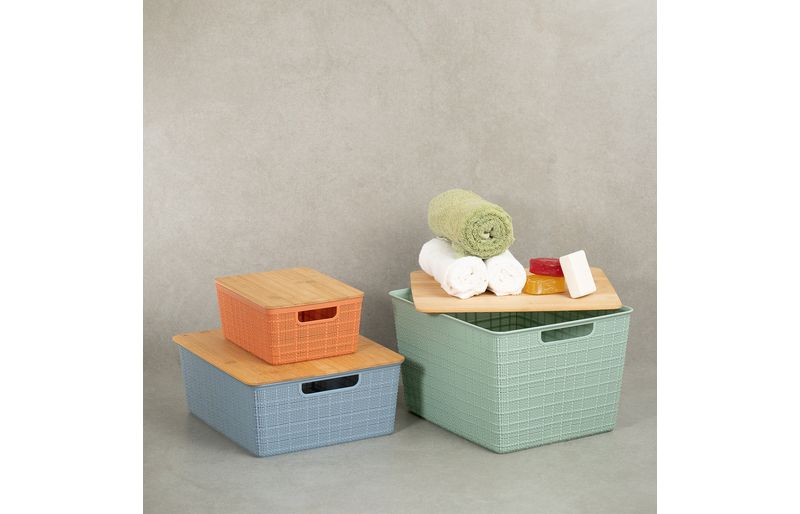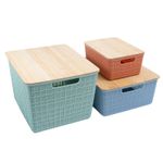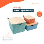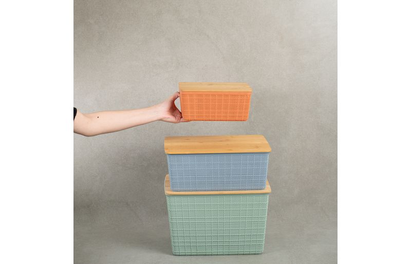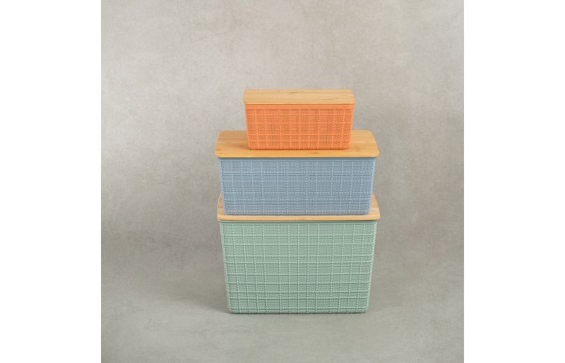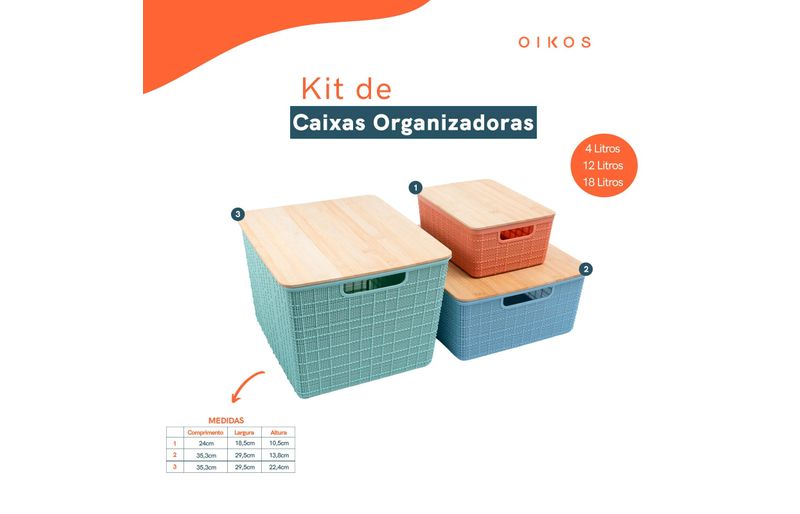 "esse é o kit caixa organizadora tampa bambu multicor p/m/g 3pçs oikos